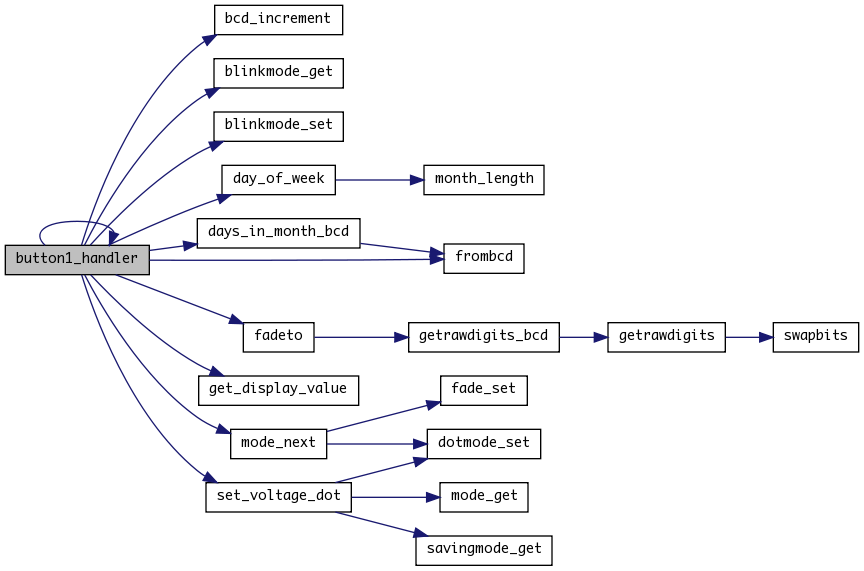 00070 { 00071 static uint8_t skip = 0; 00072 00073 if (on) { 00074 blinkmode_set(blinkmode_get() | 0200); // don't blink while button is being depressed 00075 00076 if (skip > 0) { 00077 skip--; 00078 return; 00079 } 00080 00081 switch (set_state) { 00082 case SET_NONE: 00083 mode_next(); 00084 set_voltage_dot(); 00085 skip = 1; 00086 break; 00087 00088 case SET_HOUR: 00089 set_blinkhandler(button1_handler); 00090 00091 rtc_time.hour = bcd_increment(rtc_time.hour); 00092 00093 if (rtc_time.hour == 0x24) rtc_time.hour = 0; 00094 00095 rtc_xhour(rtc_time.hour); 00096 00097 fadeto((get_display_value() & 0377) | (rtc_time.hour << 8)); 00098 break; 00099 00100 case SET_MINUTE: 00101 set_blinkhandler(button1_handler); 00102 00103 rtc_time.minute = bcd_increment(rtc_time.minute); 00104 if (rtc_time.minute == 0x60) rtc_time.minute = 0; 00105 rtc_xminute(rtc_time.minute); 00106 00107 fadeto((get_display_value() & 0xff00) | rtc_time.minute); 00108 break; 00109 00110 case SET_YEAR: 00111 set_blinkhandler(button1_handler); 00112 00113 rtc_time.year = bcd_increment(rtc_time.year); 00114 rtc_xyear(rtc_time.year); 00115 00116 rtc_xdow(day_of_week(frombcd(rtc_time.year), frombcd(rtc_time.month), frombcd(rtc_time.day))); 00117 00118 fadeto(0x2000 + rtc_time.year); 00119 break; 00120 00121 case SET_MONTH: 00122 set_blinkhandler(button1_handler); 00123 00124 rtc_time.month = bcd_increment(rtc_time.month); 00125 if (rtc_time.month == 0x13) rtc_time.month = 1; 00126 rtc_xmonth(rtc_time.month); 00127 00128 rtc_xdow(day_of_week(frombcd(rtc_time.year), frombcd(rtc_time.month), frombcd(rtc_time.day))); 00129 00130 fadeto(maketime(rtc_time.day, rtc_time.month)); 00131 break; 00132 00133 case SET_DAY: 00134 set_blinkhandler(button1_handler); 00135 00136 rtc_time.day = bcd_increment(rtc_time.day); 00137 if (rtc_time.day > days_in_month_bcd(rtc_time.year, rtc_time.month)) { 00138 rtc_time.day = 1; 00139 } 00140 rtc_xday(rtc_time.day); 00141 00142 rtc_xdow(day_of_week(frombcd(rtc_time.year), frombcd(rtc_time.month), frombcd(rtc_time.day))); 00143 00144 fadeto(maketime(rtc_time.day, rtc_time.month)); 00145 break; 00146 } 00147 } else { 00148 blinkmode_set(blinkmode_get() & 0177); // re-enable blinking 00149 cli(); blinkhandler = NULL; skip = 0; sei(); 00150 } 00151 }